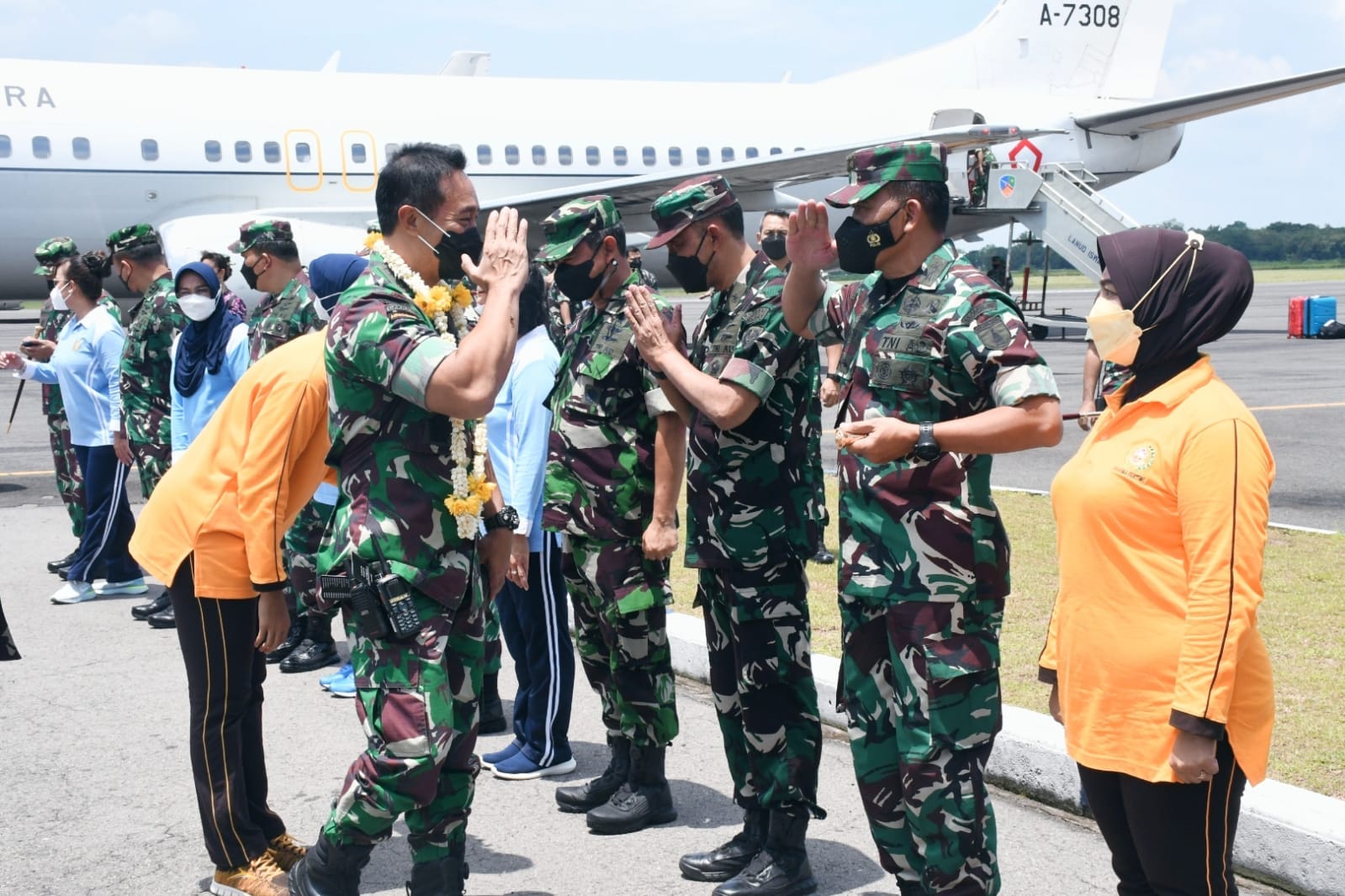 Danrem 081/DSJ, Kolonel Inf Waris Ari Nugroho dan Ketua Persit KCK Koorcab Rem 081 PD V Brawijaya, Ibu Dewi Waris Ari Nugroho turut menyambut kedatangan Panglima TNI dan Ketua Umum Dharma Pertiwi setibanya di Landasan Pacu Lanud Iswahjudi.