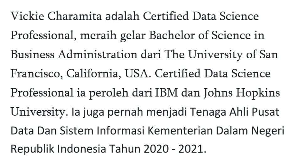 “Keberhasilan penanganan Covid-19 oleh pemerintah, misalnya, baik dalam pemetaan penyebaran virus maupun dalam pelaksanaan vaksinasi, tidak dapat tercapai tanpa dukungan Data Science,” pungkas perempuan yang pernah menjabat Tenaga Ahli Pusat Data dan Sistem Informasi Kementerian Dalam Negeri ini.