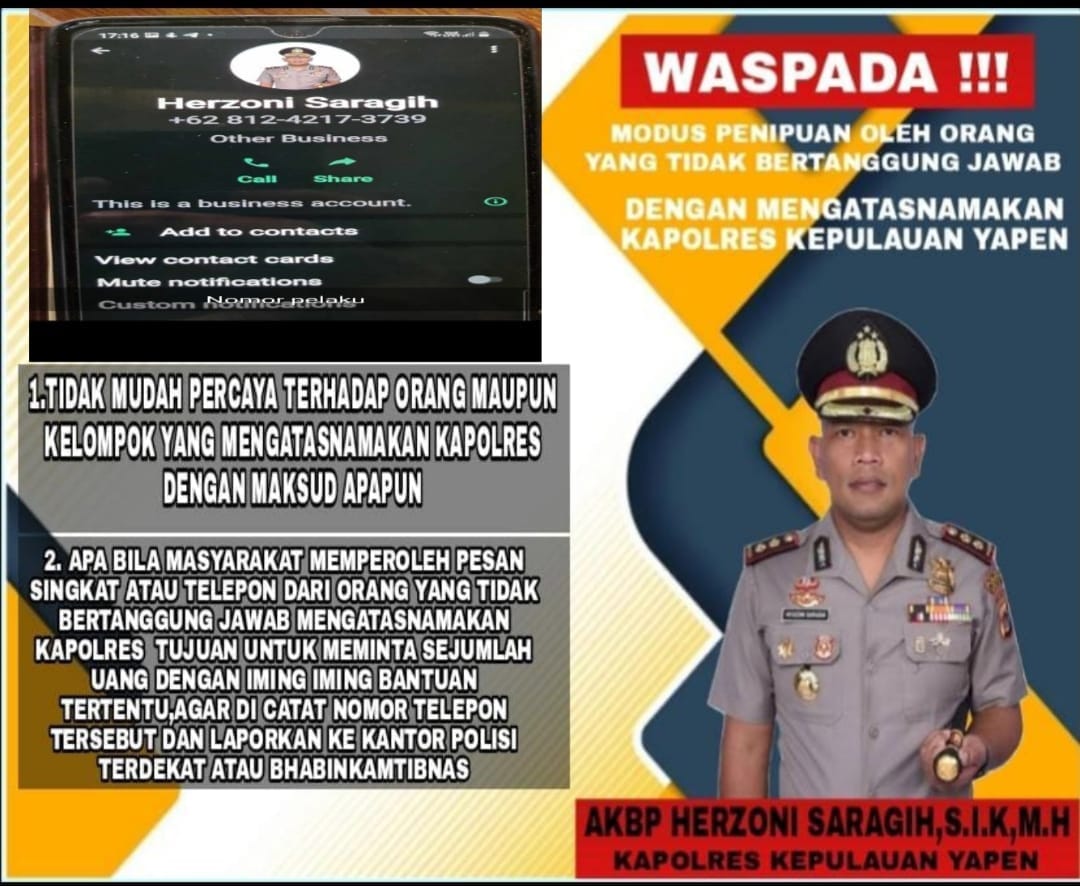 Yapen, Nusantarapos – Hati-Hati dengan beredarnya sebuah akun WhatsApp mengatasnamakan dan menggunakan foto profil Kapolres Kepulauan Yapen AKBP Herzoni Saragih yang mana akun tersebut mengirimkan pesan yang meminta untuk mentransferkan sejumlah uang dan di kirim ke nomor rekening yang ditentukan.