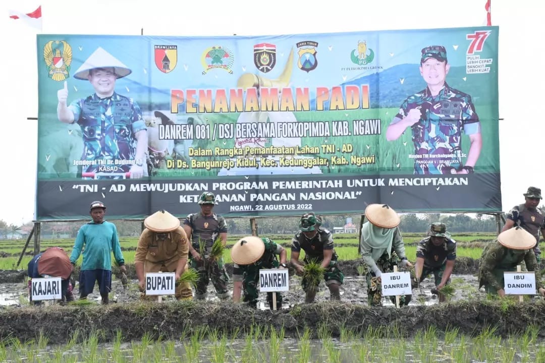 Tak hanya di Ngawi, upaya serupa juga dilakukan serentak di seluruh jajaran Korem 081/DSJ. “Hingga saat ini, kami telah mengolah aset tanah milik TNI-AD yang terdapat di wilayah kami dengan berbagai macam tanaman pertanian yang produktif. Mulai dari padi seluas 23 hektar, Jagung 24,3 hektar, ketela 19,5 hektar, tebu 7 hektar dan pisang 0,5 hektar,” kata Danrem Kolonel Deni dalam sambutannya usai tanam padi simbolis di lokasi,” Senin (22/8/2022).