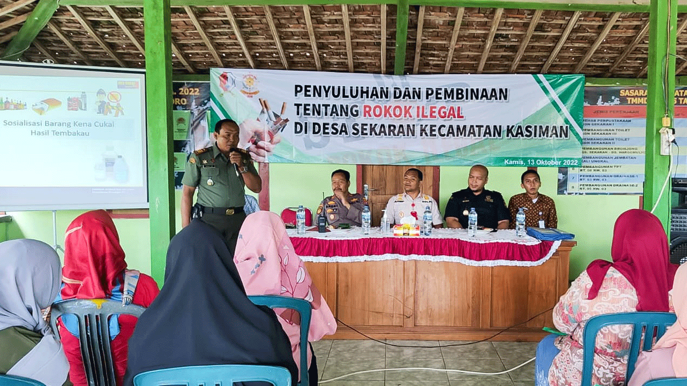 Dalam rangka rangkaian kegiatan TNI Manunggal Membangun Desa (TMMD) ke- 115 tahun 2022 di Desa Sekaran, Kecamatan Kasiman, Pemerintah Kabupaten (Pemkab) Bojonegoro, melalui Satuan Polisi Pamong Praja (Satpol PP) mengadakan penyuluhan dan pembinaan tentang rokok ilegal, di Balai Dusun Ngantru, Desa Sekaran, Kecamatan Kasiman, Kamis (13/10/2022).