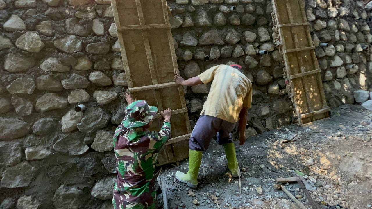 MALANG,NUSANTARAPOS.- Satgas TNI Manunggal Membangun Desa (TMMD) 118 dari Kodim 0818 bersama warga melakukan pemasangan papan cor untuk dinding penahan tanah di area yang kritis. Langkah ini bertujuan untuk mencegah kemungkinan longsor dan menjaga stabilitas tanah di Desa Sumberpetung Kecamatan Kalipare Kabupaten Malang, Kamis (28/09/23).