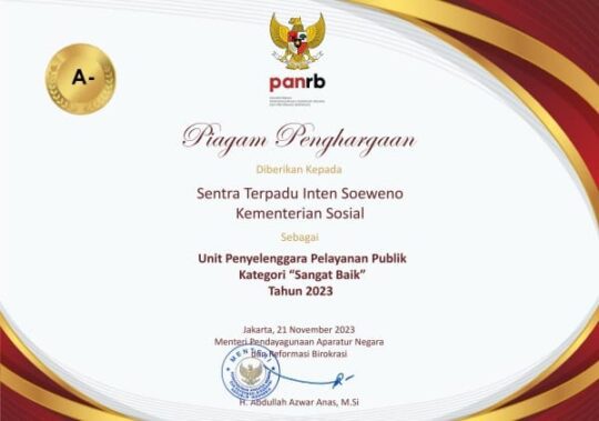 Unit Penyelenggaran Pelayanan Publik Kategori “Sangat Baik” Tahun 2023 yang diraih oleh Unit Pelaksana Teknis (UPT) Sentra Terpadu Inten Soeweno (STIS) Bogor dengan nilai indeks 4,23 kategori A-. (Ri)
