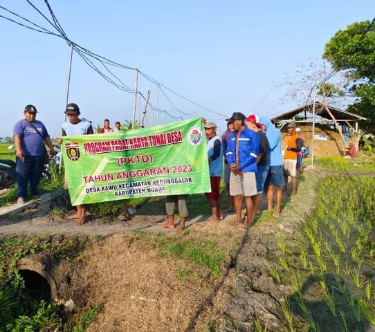 NGAWI, NUSANTARAPOS – Masyarakat Desa Kawu dengan antusias menghadiri kegiatan Program Padat Karya Tunai Desa (PKTD) yang dilaksanakan di Desa Kawu, Dusun Kliyangan, Kecamatan Kedunggalar, Kabupaten Ngawi.