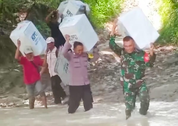 “Diperjalanan kami banyak menemui hambatan seperti menyeberangi sungai, jalan setapak yang licin dan berlumpur sehingga pendistrubusian logistik Pemilu ini kami lakukan secara estafet,” ucap Sertu Wahyu Widodo.