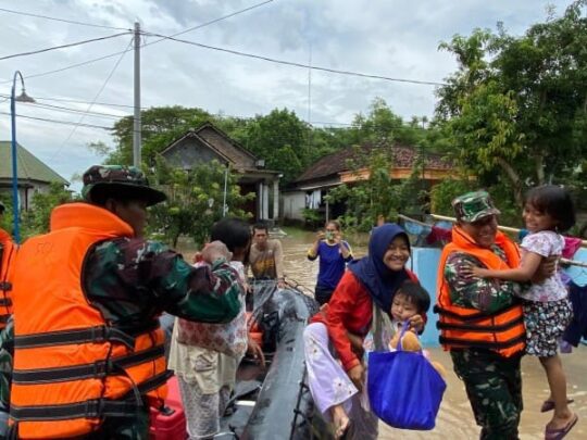 Untuk membantu evakuasi para warga yang terpaksa harus mengungsi, Korem 081/DSJ tak tinggal diam. Selain mengerahkan para Babinsanya, juga nengerahkan personel dari satuan Denbekang V/1 Madiun yang dilengkapi dengan perahu karet.