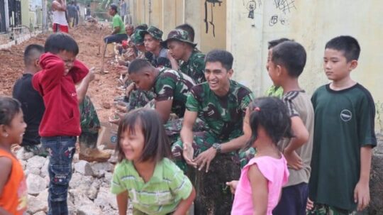 BATAM,NUSANTARAPOS,– Kepenatan dalam bekerja di program TNI Manunggal Membangun Desa (TMMD) Kodim 0316/Batam, oleh anggota satgas TMMD dipergunakan untuk beristirahat sambil sendagurau dengan anak-anak di sekitar pengerjaan. Dengan dekatnya dengan anak-anak inilah mereka dapat mengurangi rasa kangen kepada keluarganya karena sudah selama sekitar 6 hari ini mereka meninggalkan anak dan istrinya.