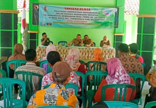 BOJONEGORO, – Dalam rangka mendukung kegiatan program TNI Manunggal Membangun Desa (TMMD) ke- 120 tahun 2024, Dinas Kependudukan dan Catatan Sipil (Disdukcapil) Kabupaten Bojonegoro menggelar Sosialisasi Administrasi Kependudukan di Balai Desa Napis Kecamatan Tambakrejo, Senin 13/5/2024).