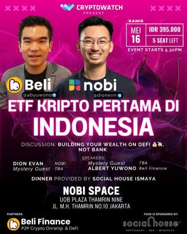 Jakarta, 13 Mei 2024 – Pada tanggal 16 Mei 2024, jam 17.30 WIB, UOB Plaza Thamrin, Jakarta akan jadi tempat seru banget buat acara “ETF Kripto Pertama di Indonesia“. Acara ini akan menampilkan para pembicara keren yang sangat berpengalaman di industri kripto dan blockchain, termasuk Albert Yuwono dari Beli Finance dan Dion Evan dari NOBI.