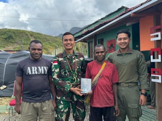 Tk Koper Satgas Yonif 509 Kostrad Bagikan Al-Kitab Kepada Salah Satu Tokoh Pemuda di Intan Jaya