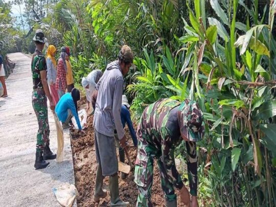 Kerja Sama TNI dan Warga Sijenggung Pengurugan Kiri Kanan Rabat Beton untuk Infrastruktur Desa