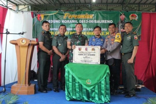 BOJONEGORO, – Komandan Kodim (Dandim) 0813 Bojonegoro Letnan Kolonel Czi Arief Rochman Hakim, SE., MM., meresmikan bangunan baru kantor Markas Koramil 06/Baureno. Peresmian kantor yang terletak di Jalan Raya Bojonegoro – Babat turut Desa/Kecamatan Baureno tersebut, ditandai dengan penandatanganan prasasti, Rabu (19/6/2024).