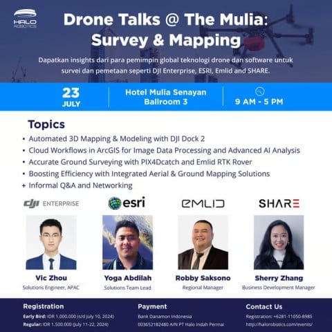 Johannes Soekidi, Managing Director Halo Robotics, mengatakan acara ini akan menjadi wadah bagi para profesional industri untuk mendapatkan insight mengenai teknologi terkini dalam bidang survey dan mapping, yang ditawarkan oleh pemimpin global seperti DJI Enterprise, Esri, Emlid, dan SHARE.