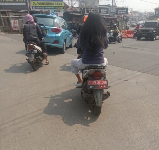 Wanita tersebut mengendarai motor plat merah B 6546 ZQA itu terlihat langsung dari kasat mata wartawan saat bertugas liputan di wilayah Hukum Polres Metro Depok yaitu sekitar Jalan Tole Iskandar menuju arah ke jalan Sentosa Raya Sukmajaya Depok, Minggu (13/07/24).