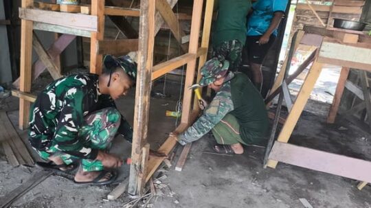 Sertu Syafril Januar dan Pratu Hendri Wahyudi, mereka tengah mengerjakan penyusunan kayu untuk kerangka dinding rumah Kaspini. “Kita sudah membagi pekerjaan masing-masing agar lebih cepat,” katanya kepada wartawan, Selasa (23/7/24).
