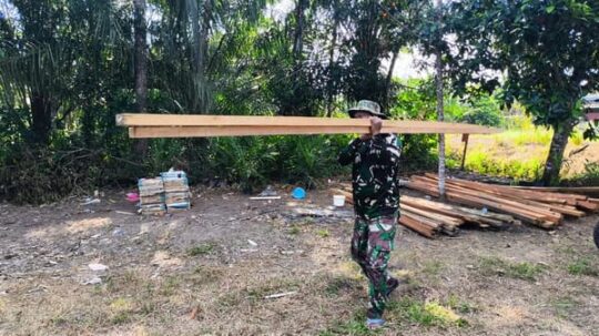 Seperti halnya yang dilakukan oleh Pratu Nanang Bayu ini, mendapat bagian untuk mengangkat kayu yang akan digunakan untuk membuat rumah Kaspini warga RT 03, Desa Manyahi, Kac. Mantangai, Kab. Kapuas, Prov. Kalimantan Tengah.