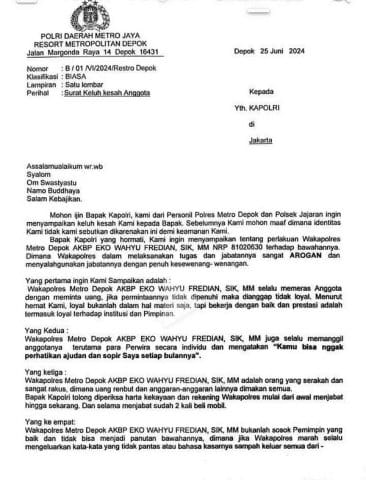 Beredar Surat Keluhan Anggota Polres Metro Depok ke Kapolri