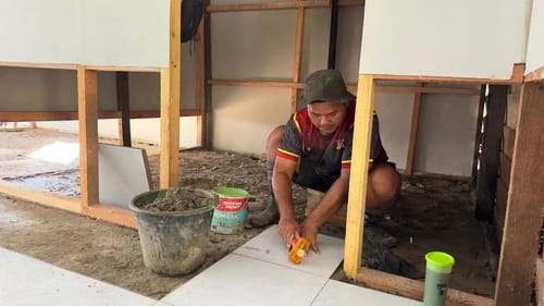 Praka Arya Graha, salah satu anggota TNI yang terlibat, menunjukkan dedikasi tinggi dalam menyelesaikan pemasangan keramik di rumah Ibu Kaspini. Ia bekerja keras untuk memastikan bahwa keramik yang dipasang tidak hanya berfungsi dengan baik, tetapi juga membuat rumah tampak bersih dan sehat.