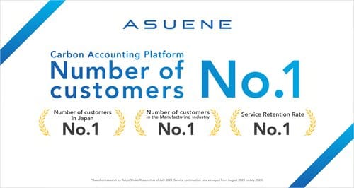 Asuene Inc.’s carbon accounting platform, “ASUENE,” has surpassed 9,000 number of customers, becoming the top service in Japan, according to the “CO2 Emissions Visualization Service Introduction Survey” published by Tokyo Shoko Research. It also ranks first in total number of customers in the manufacturing industry and No.1 in the service retention rate.