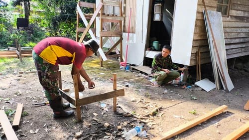 KAPUAS,-Dalam rangkaian kegiatan TMMD Reguler Ke-121 Tahun 2024, anggota TNI bersama warga Desa Manyahi, Kecamatan Mantangai, Kabupaten Kapuas, Kalimantan Tengah, melaksanakan pembangunan teras depan rumah milik A. Darwin, seorang warga lanjut usia yang berumur 83 tahun.