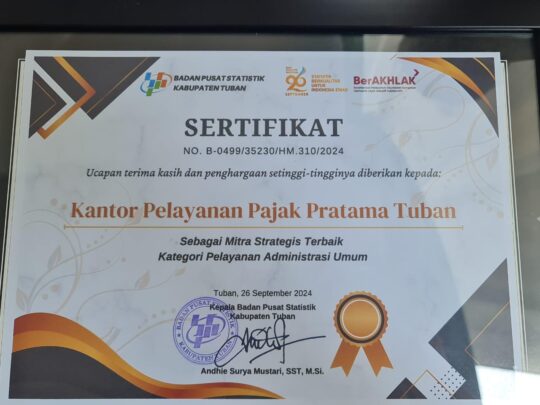Sedangkan untuk Kantor Pelayanan Pajak Pratama Tuban, sebagai Mitra Strategis Terbaik Kategori Pelayanan Administrasi Umum dan untuk Perusahaan Daerah Air Minum sebagai Mitra Strategis Terbaik Kategori Responden Survei Bidang Neraca Nasional.