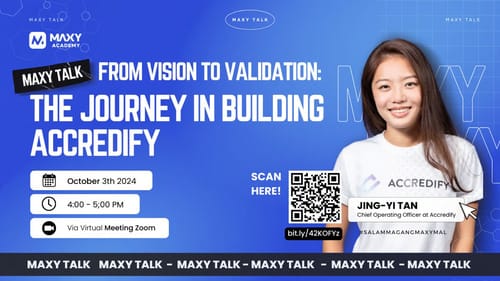 MAXY Academy kembali menggelar acara talkshow mingguan bertajuk Maxy Talk dengan tema “From Vision to Validation: The Journey in Building Accredify” yang dilaksanakan pada Kamis, 3 Oktober 2024. Acara ini mengundang Jing Yi, COO dari Accredify, untuk membagikan kisah dan pengalamannya membangun Accredify sejak tahun 2020. Dalam sesi ini, Jing Yi memberikan wawasan yang mendalam tentang perjalanan perusahaannya dalam membangun solusi inovatif di sektor teknologi digital.