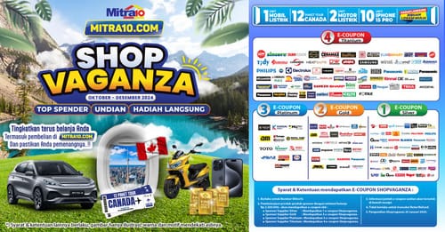 Hadiah grand prize untuk pelanggan setia Mitra10 meliputi 12 paket wisata ke Kanada, 1 unit mobil listrik, 2 unit motor listrik, 10 unit iPhone Pro, ribuan logam mulia 1 gram, serta voucher belanja yang membuat pengalaman belanja di Mitra10 semakin menguntungkan. Untuk informasi lebih lanjut mengenai syarat dan ketentuan Shopvaganza 2024, kunjungi situs resmi Mitra10 di link berikut atau chat Contact Center 0878 0002 1010.