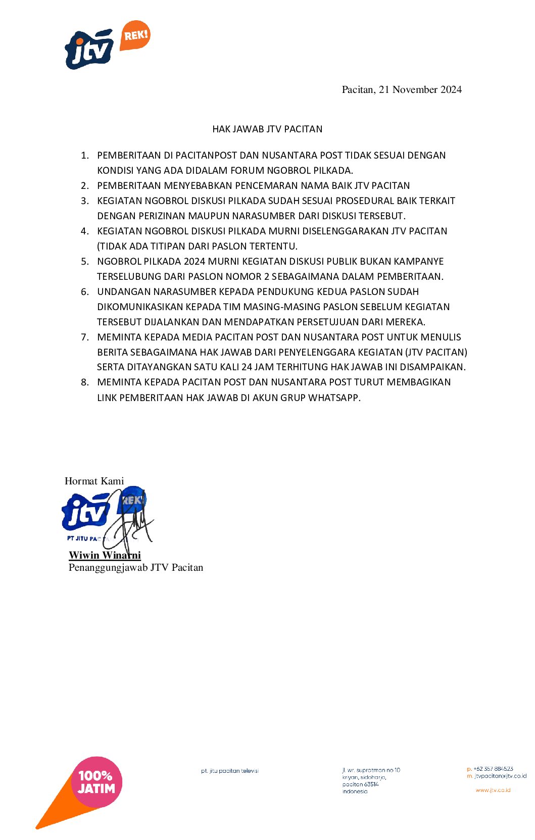 - MEMINTA KEPADA MEDIA PACITAN POST DAN NUSANTARA POST UNTUK MENULIS BERITA SEBAGAIMANA HAK JAWAB DARI PENYELENGGARA KEGIATAN (JTV PACITAN) SERTA DITAYANGKAN SATU KALI 24 JAM TERHITUNG HAK JAWAB INI DISAMPAIKAN.