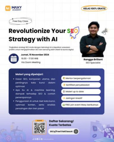 Acara yang diselenggarakan oleh MAXY Academy ini berlangsung secara daring melalui Zoom Meeting. Dengan diikuti oleh 20 peserta dari berbagai latar belakang, kelas ini berhasil memberikan wawasan praktis tentang bagaimana mengoptimalkan strategi SEO menggunakan teknologi AI.