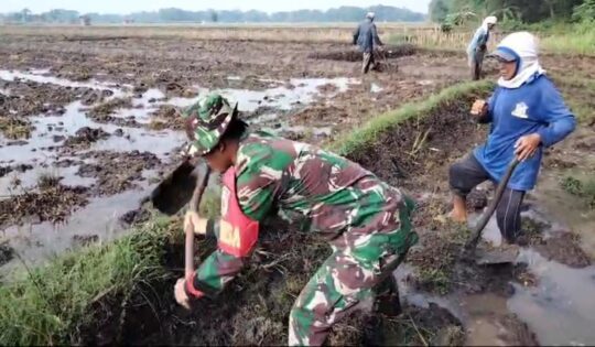 Menindaklanjuti dalam upaya tersebut, Sertu Purwanto selaku Babinsa dalam kegiatannya kali ini ikut turun ke sawah membantu petani membersihkan saluran irigasi yang dipenuhi rumput guna mengupayakan normalisasi saluran irigasi secara manual, agar memperlancar aliran air ke persawahan warga dan mengolah lahan milik warga binaannya dengan menggunakan cangkul.