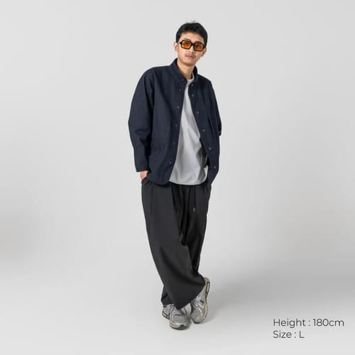 Desain kerah stand collar dan kancing snap menambahkan kesan modern dan fungsional pada jaket ini.