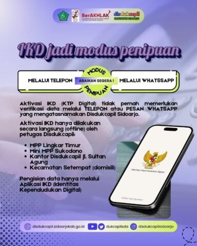 Disampaikan beberapa informasi agar tidak menjadi korban penipuan aktivasi IKD. Yang pertama Disdukcapil Kabupaten Sidoarjo tidak pernah menghubungi terlebih dahulu untuk menawarkan pelayanan atau meminta data pribadi melalui pesan WhatsApp, telepon, atau SMS.