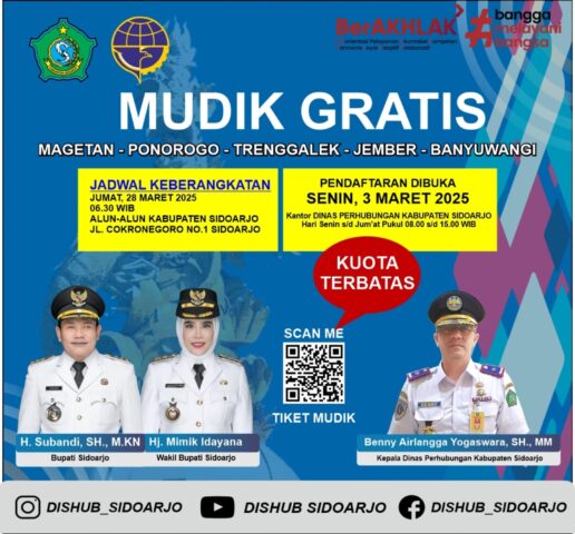 Sidoarjo, Nusantarapos.co.id – Pemkab Sidoarjo kembali memberikan layanan mudik gratis untuk masyarakat pada lebaran tahun ini. Pendaftarannya sudah dibuka mulai tanggal 3 Maret 2025.