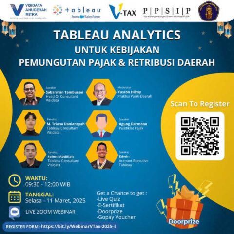 Jakarta, 11 Maret 2025 – Visidata, perusahaan penyedia jasa visualisasi data, mengadakan seminar bertajuk “Tableau Analytics untuk Kebijakan Pemungutan Pajak & Retribusi Daerah” pada Selasa, 11 Maret 2025 pukul 09.30 – 12.00 WIB. Seminar ini bertujuan memperkenalkan Tableau Analytics sebagai solusi modern yang mampu mengoptimalkan pengelolaan pajak dan retribusi daerah melalui visualisasi data yang interaktif dan real-time. Peserta akan mendapatkan wawasan tentang bagaimana Tableau mendukung pengambilan keputusan berbasis data (data-driven), membantu monitoring penerimaan daerah, serta mengidentifikasi potensi kebocoran pajak dan retribusi. Selain itu, doorprize menarik juga disediakan bagi peserta yang beruntung. Sebagai perusahaan yang fokus pada jasa visualisasi data, Visidata terus berkomitmen mendukung transformasi digital di sektor pemerintahan melalui solusi analitik visual yang inovatif dan efektif.