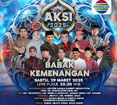 Program ajang pencarian bakat ustaz dan ustazah terbaik dari seluruh Indonesia yang telah menjadi program unggulan INDOSIAR selama bulan Ramadan akan segera memasuki babak kemenangan yang tayang pada hari Sabtu, 29 Maret 2025 pukul 02.00 WIB. Peserta yang lolos ke babak Kemenangan akan berkompetisi menyampaikan tausiah terbaik mereka untuk memikat hati para juri dan meraih gelar juara AKSI 2025. Di babak Kemenangan ini, tema tausiah yang dibawakan oleh peserta akan diberikan oleh Bapak Prof. Dr. Nasaruddin Umar, MA. selaku Menteri Agama Republik Indonesia dan akan dinilai oleh Ulama terbaik Indonesia, yakni Funtastic 4 yang terdiri dari Mamah Dedeh, Ustaz Subki Al-Bughury, Ustaz Wijayanto, dan Ustaz Soleh Mahmoed (Solmed). Selain itu, Rhoma Irama & Soneta group juga akan hadir dan menghibur panggung AKSI 2025. Saksikan Babak Kemenangan AKSI 2025 hari Sabtu, 29 Maret 2025 pukul 20.30 WIB dan disiarkan kembali pada hari Minggu, 30 Maret 2025 pukul 02.00 WIB, hanya di INDOSIAR.