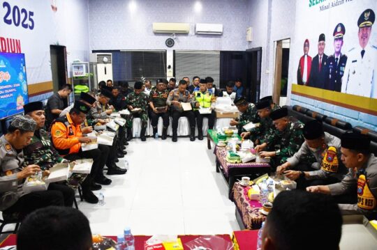 Madiun, – Danrem 081/DSJ, Kolonel Arm Untoro Hariyanto sahur bareng dengan personel TNI-Polri dan petugas lainnya di pos pengamanan exit tol Dumpil, Madiun, Sabtu (29/3/2025). Ia menyebut, hal itu merupakan bentuk kebersamaan di antara mereka.