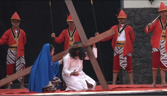 Visualisasi yang digelar di halaman Gereja ,menggambarkan peristiwa penyaliban hingga wafatnya Yesus Kristus pada peringatan Jumat Agung tersebut sebagai rangkaian perayaan Paskah 2025.