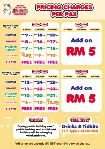 From Monday to Thursday, pricing remains unchanged for both Happy Hours (11 AM – 6 PM) and Normal Hours (after 6 PM). Whether you’re a student, senior, member, or visiting with little ones, you can enjoy affordable karaoke sessions packed with value and comfort.