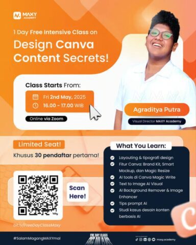 Dalam kelas ini, peserta akan belajar langsung bersama Agraditya Putra, Visual Director MAXY Academy, yang akan membagikan teknik-teknik praktis seputar desain konten yang estetik, efisien, dan konsisten. Materi akan mencakup pemanfaatan fitur-fitur AI dalam Canva seperti Magic Write, Text-to-Image, hingga Brand Voice, serta strategi membangun konten profesional yang relevan untuk kebutuhan personal branding, portofolio, maupun bisnis digital.