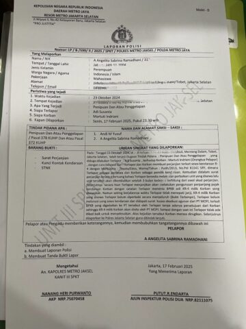 Laporan dengan nomor Polisi nomor : LP/B/599/II/2025/SPKT/Polres Metro Jaksel/Polda Metro Jaya ini melaporkan dugaan tindak pidana Penipuan atau penggelapan pasal 378 KUHP dan atau pasal 372 KUHP.
