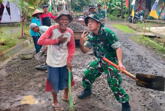 Cilacap — Suasana keakraban dan kebersamaan terasa hangat di lokasi pelaksanaan TNI Manunggal Membangun Desa (TMMD) Reguler ke-124 Kodim 0703/Cilacap. Momen penuh canda tawa terpancar antara Lettu Arh G. Simanjuntak dengan salah satu warga setempat, Mbah Muhroni, “ini mataku, ini gigiku” saat keduanya bahu-membahu melaksanakan tugas langsir batu split di Desa Kaliwungu, Kecamatan Kedungreja, Kabupaten Cilacap, Minggu (25/5/2025).