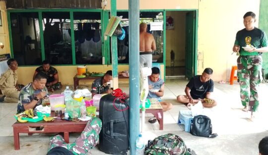 “Kami merasa seperti keluarga besar,” ujar Serda Arif salah satu anggota satgas, sambil menyuap nasi dengan lahap.
