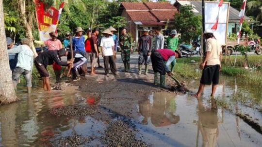 Cilacap — Menjelang upacara penutupan TNI Manunggal Membangun Desa (TMMD) Reguler ke-124, Satgas TMMD Kodim 0703/Cilacap bersama warga Desa Kaliwungu bergotong royong mencari solusi untuk mengatasi genangan air yang menggenangi Lapangan Krida Utama. Lapangan ini direncanakan menjadi lokasi utama pelaksanaan upacara penutupan TMMD, Jumat (30/5/2025).