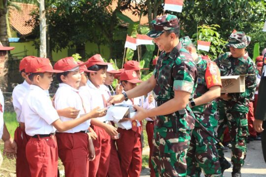 Momen haru sekaligus menggemaskan terjadi ketika Brigjen TNI Zainul Bahar membagikan cokelat kepada ratusan anak-anak Desa Kaliwungu. Raut wajah polos mereka langsung berbinar-binar penuh kegembiraan saat menerima kudapan manis tersebut dari tangan jenderal bintang satu itu. Senyum dan tawa riang pun pecah, memenuhi area upacara.