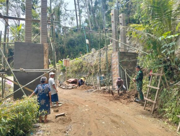 PACITAN,NUSANTARAPOS, – Anggota Satgas TMMD Kodim 0801/Pacitan bersama warga membuat Gapura Pintu masuk lokasi menuju sasaran Rabat jalan beton bertempat di Dusun Krajan, Desa Petungsinarang, Kecamatan Bandar, Kabupaten Pacitan, Rabu (29/10/2025). Hal ini dilakukan untuk memberikan tanda sekaligus membuat ikon di lokasi Program TMMD Ke-126 Desa Petungsinarang.