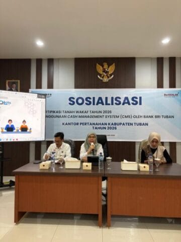 TUBAN – Nusantarapos.co.id – Bank BRI Cabang Tuban beri sosialisasi Layanan CMS BRI atau biasa disebut Qlola Cash Management bersama Badan Pertanahan Nasional (BPN Tuban. Branch Manager Bank Rakyat Indonesia (BRI) Cabang Tuban, M Ismail Fahmi, menghadiri kegiatan terbalut sosialisasi sertifikasi tanah wakaf dan layanan CMS BRI itu.