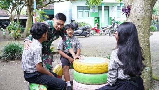 Sejumlah anak nampak bermain dengan salah seorang anggota Satgas. Tak jarang mereka pun ada yang minta digendong ketika pulang sekolah.