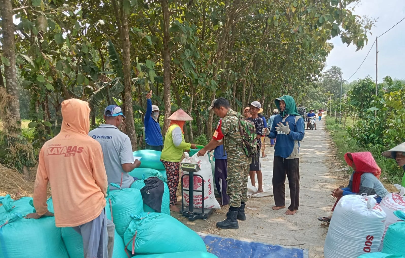 Serka Suhadi hadir langsung di lokasi panen untuk memantau proses penimbangan dan distribusi gabah hasil panen warga.