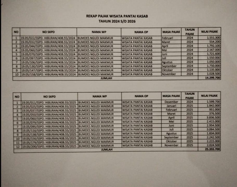 Perbincangan pun makin ramai ketika beberapa warga mencari informasi ke Kantor Pajak Daerah dan mendapatkan hasil rekap pajak wisata Pantai Kasab Tahun 2024 sampai dengan 2026.