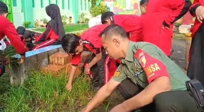 Kegiatan yang berlangsung di lingkungan sekolah tersebut diikuti oleh para siswa, guru, serta Babinsa yang turut berbaur langsung dalam membersihkan area sekolah.